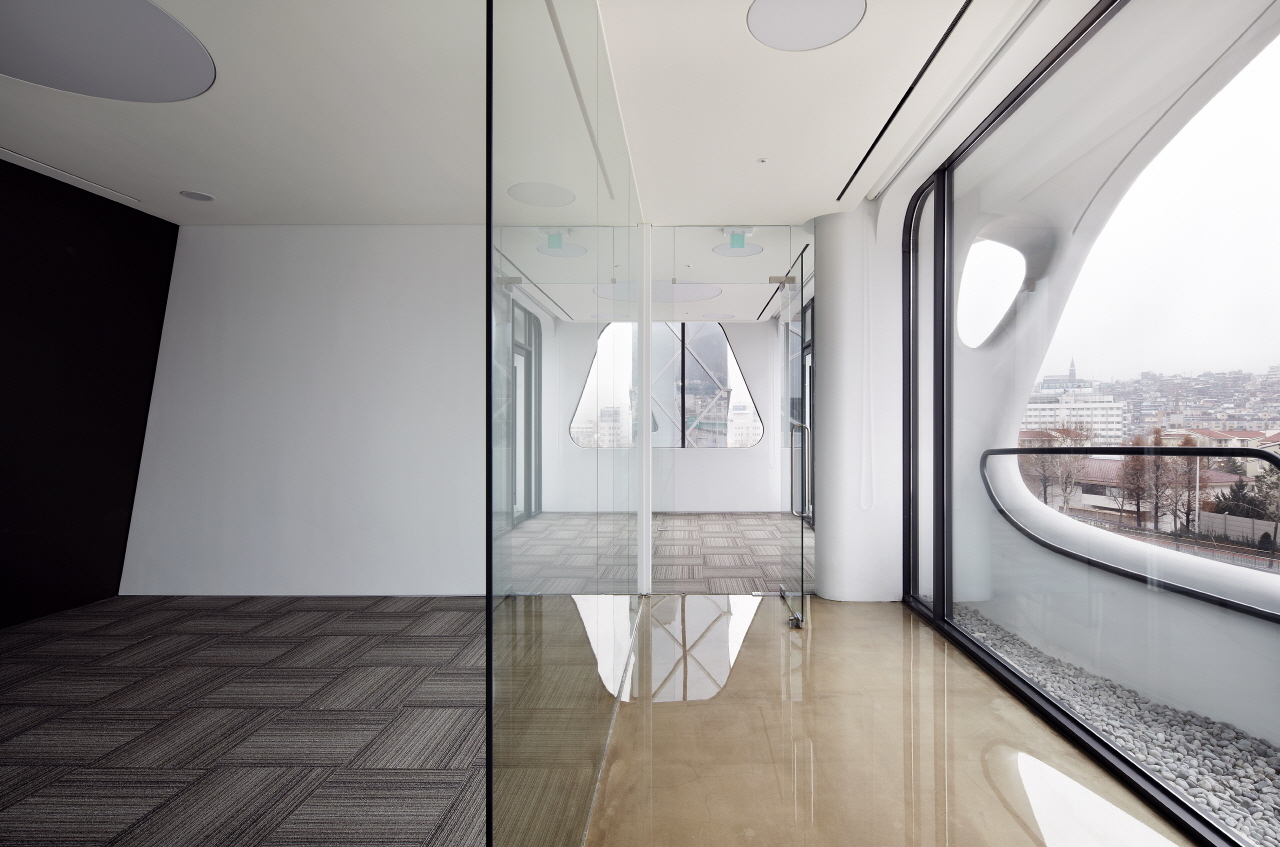 L’atelier d’architecture The System Lab réalise le projet « Hannam-Dong HANDS Corporation », situé sur 104 Hannam Blvd., qui relie le Tunnel 2 et Hannam Bridge en Corée de Sud. Ce sont des bureaux où certains passent plus de huit heures par jour dans des pièces fermées. De ce fait l’interaction visuelle entre les utilisateurs de l’immeuble, les passagers en voiture et les piétons dans la rue pendant des embouteillages, a été explorée. La façade, qui compose le paysage urbain, a l’objectif d’écarter la communication unilatérale où seuls les utilisateurs du bâtiment sont autorisés à regarder vers l’extérieur. Un balcon est prévu adjacent aux bureaux. D’autres petits balcons sont prévus comme espaces d’échange, de conversations téléphoniques privées et de pause pour respirer un peu d’air frais. Ces balcons sont perçues sous forme de parc flottant pour découvrir la ville. Une coque en façade et la structure principale du bâtiment laissent la place aux balcons. Les vagues entre les balcons sont répétées pour différencier les étages.