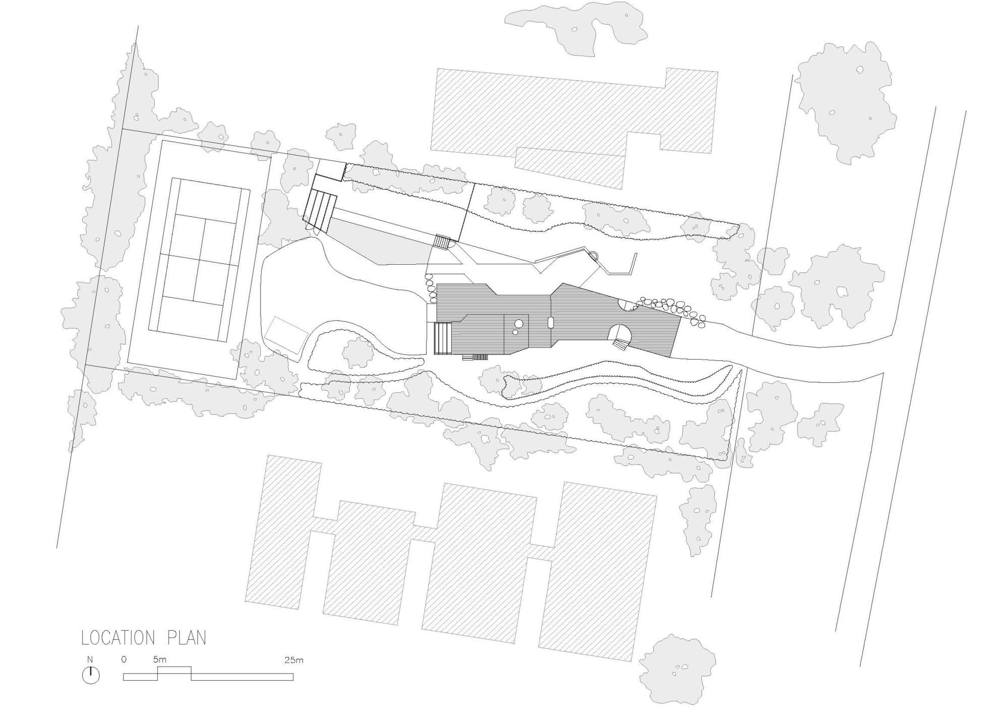 Les connexions directes et variées au paysage environnant étaient critiques. Une cour Nord s’intégre dans le site naturel. A l’Ouest le lien est plus discret et passe à par un salon / salle de jeux pour enfants vers l’arrière du site .