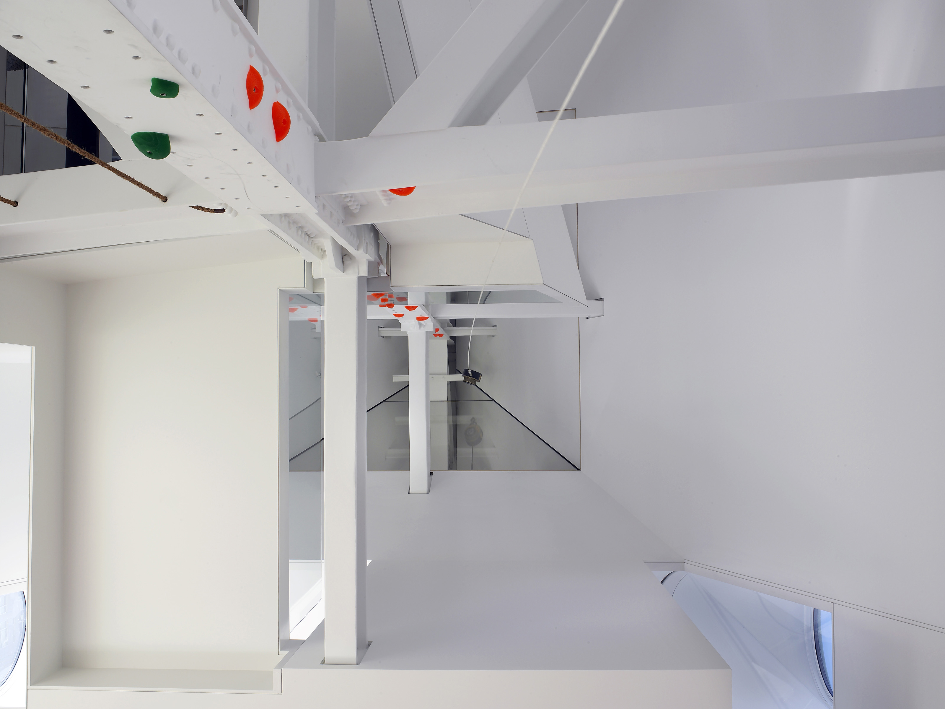Aujourd’hui l’architecte David Hotson basé à New York nous partage le Living Room de son projet Skyhouse. Cette espace de vie principal occupe toute l’extrémité nord de l’appartement. Ici, le plafond s’élève à la face inférieure de la terrasse du troisième niveau, puis se rétrécit vers le haut par la hauteur de quatorze mètres. Au milieu, on peut voir que le balcon est suspendu sur les poutres structurelles en acier. Au niveau du grenier, la paroi de verre en pente vers l’extérieur offre une vue vertigineuse sur l’espace de vie et les quatre niveaux en dessous. Meubles, tissus et finitions ont été conçus par l’architecte d’intérieur Ghislaine Viñas Interior Design..