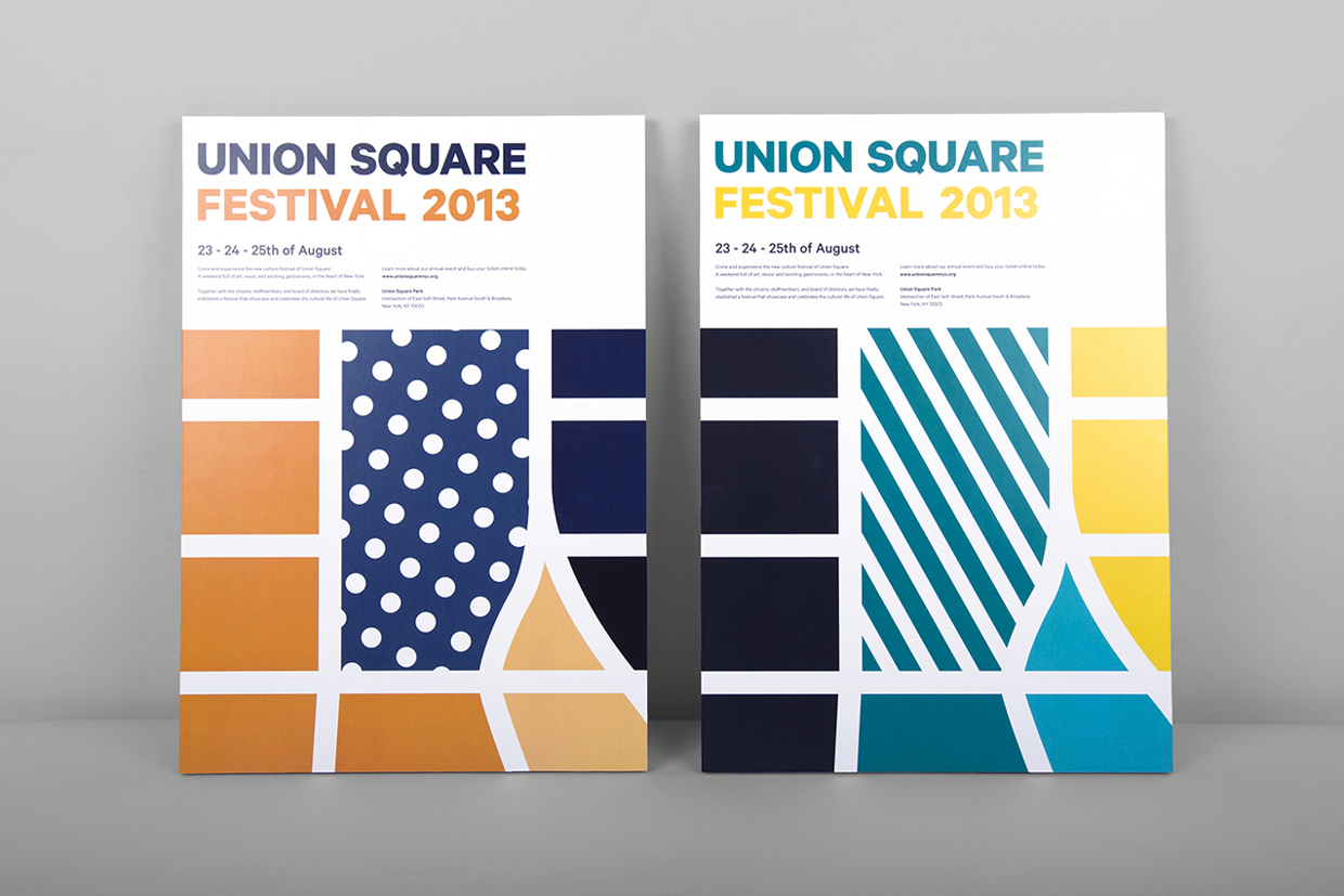 Union Square est un événement culturel annuel qui célèbre les entreprises implantées autour du parc portant le même nom, situé dans le quartier de Manhattan à New-York. L’identité visuelle de Union Square, réalisée par Thorbjørn Gudnason, présente une expression graphique contemporaine et colorée. Diverses affiches et flyers crées permettront au public de la région de Union Square de découvrir le programme complet du festival.