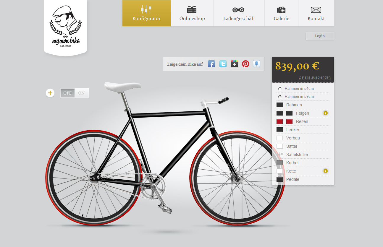Dans le coeur de Düsseldorf en Allemagne, vous trouverez un charmant magasin qui vous proposera de composer votre vélo à la carte ou de trouver vos accessoires. Mais aussi vous pourrez y boire un café et simplement taper la discute. Voici leur site Myownbike qui propose un simple et efficace configurateur en ligne réalisé par l’agence DieTaikonauten.