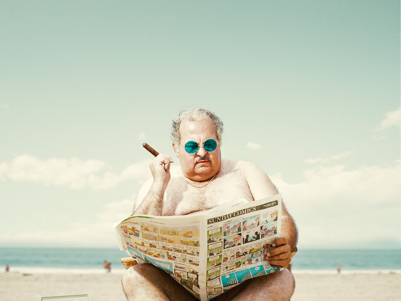 Le photographe Dean Bradshaw basé à Venice, en Californie, signe la série « Man of the Beach » (L’homme de la plage). L’artiste explore l’anti-héros non conventionnel, plus à l’aise dans son slip de bain que vous êtes dans votre pyjama.